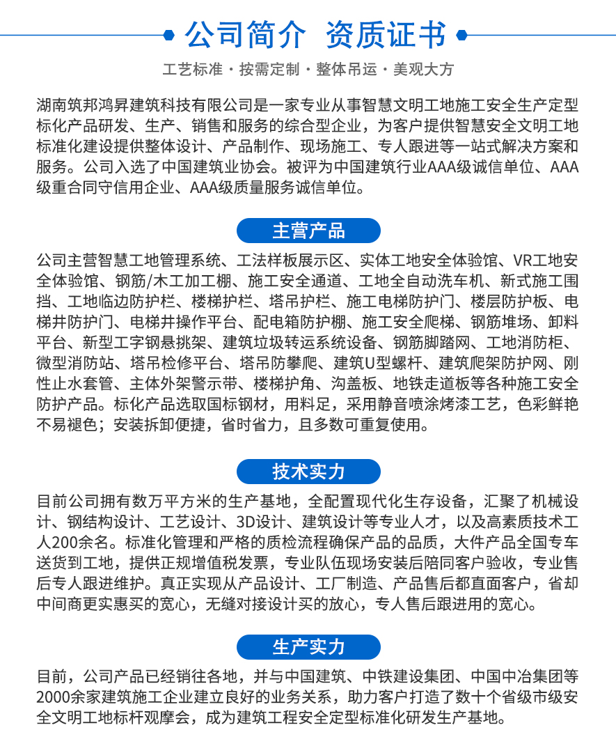 [筑邦鴻昇]施工工法質(zhì)量樣板展示區(qū)是根據(jù)施工單位的要求和標(biāo)準(zhǔn)制作,展示其在本工程所采用的材料及其質(zhì)量、施工工藝、施工流程、技術(shù)水平及施工質(zhì)量。框剪主體結(jié)構(gòu)樣板,不僅是展示施工工藝、明確施工質(zhì)量、展現(xiàn)施工流程、探索施工技術(shù)的一種有效手段,也是向外界展示工程品質(zhì)和企業(yè)形象的廣告牌。工法質(zhì)量樣板特點(diǎn):1.根據(jù)住建部建筑質(zhì)量標(biāo)準(zhǔn)規(guī)范制作,可以根據(jù)客戶的的要求和圖紙量身定制。2.移..